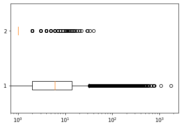 plt.boxplot([ns_book7['대출건수'],ns_book7['도서권수']], vert = False)