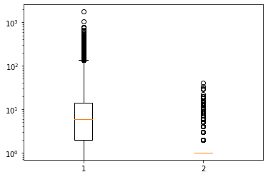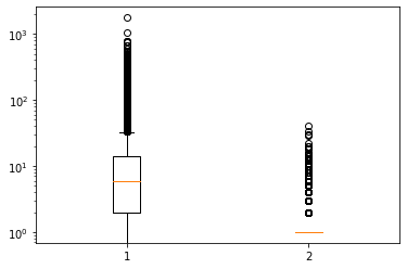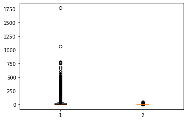 plt.boxplot([ns_book7['대출건수'],ns_book7['도서권수']], whis = 10)
